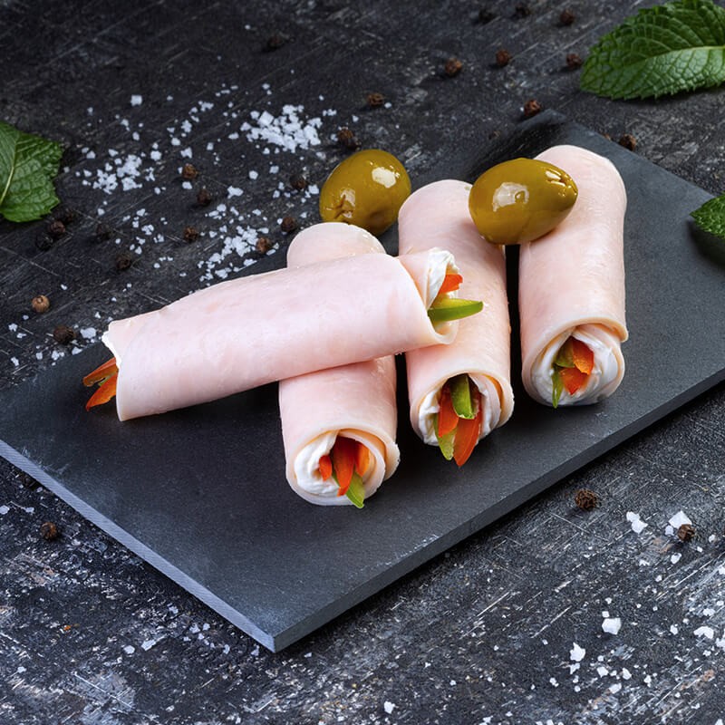 3.- Untar queso crema y colocar de 3 a 4 julianas de morrón verde y rojo, enrollar, continuar el proceso con cada una de las rebanadas de pechuga de pavo natural Tangamanga.