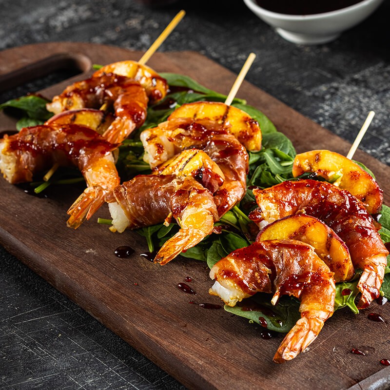 4.- Limpiar los camarones y envolver cada uno con una tira de jamón serrano, cortar los duraznos en gajos, armar cada brocheta alternando durazno y camarón envuelto.