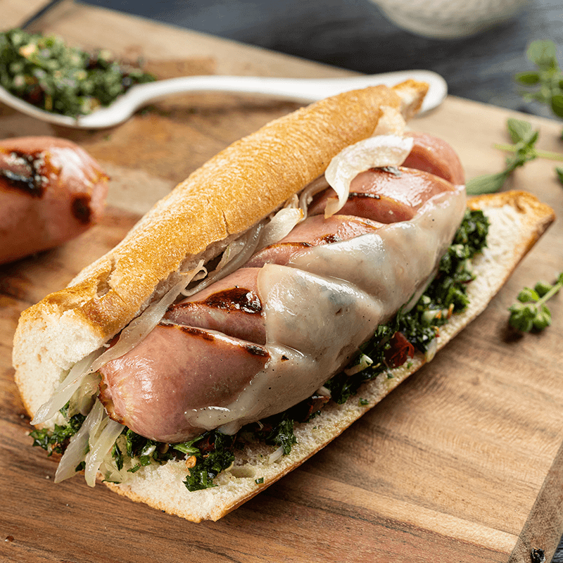 4. Colocar en la baguete la salsa de chimichurri, las cebollas caramelizadas, el chorizo argentino y una rebanada de queso