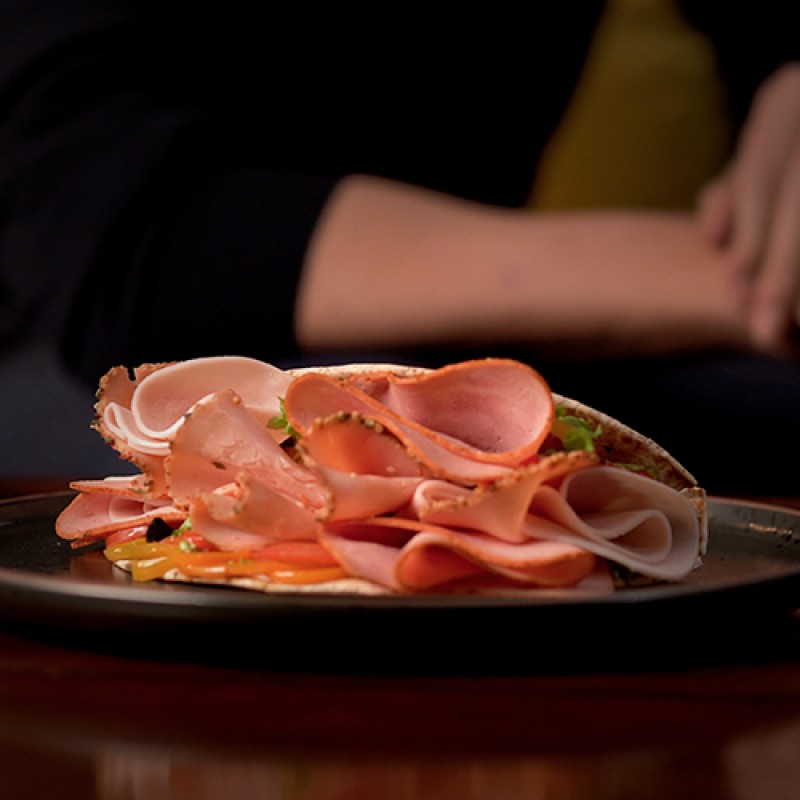 4. Para armar el Gyro, calentar un poco el pan pita y untar una capa ligera de queso de cabra. dependiendo de nuestra elección, poner el Lomo Bocado del Rey en pequeñas tiras al centro del pan pita. agregar la lechuga, los pimientos morrones con las aceitunas negras, un poco de cebolla morada y rebanadas de jitomate, para enrollar.