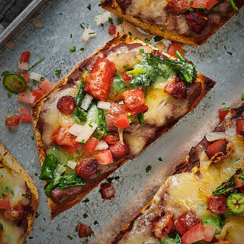 2.-Corta la baguette por la mitad, unta frijoles refritos, luego espinacas blanqueadas, queso mozzarella y la chistorra a medio término.