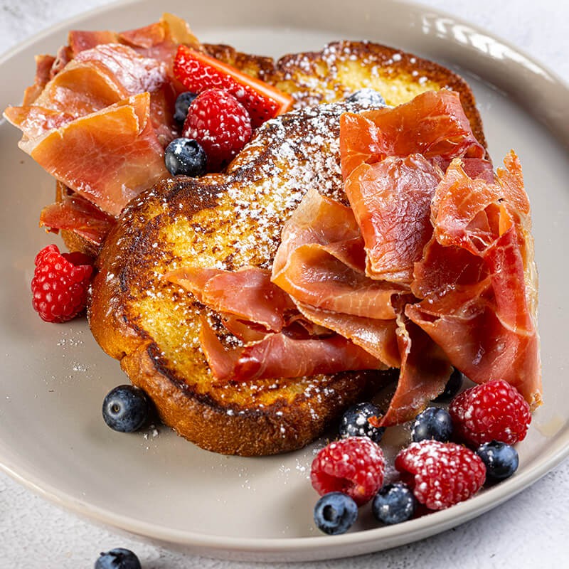 6.-Servir el pan francés acompañado del jamón serrano horneado, agregar los frutos rojos, bañar con miel y espolvorear azúcar glas.