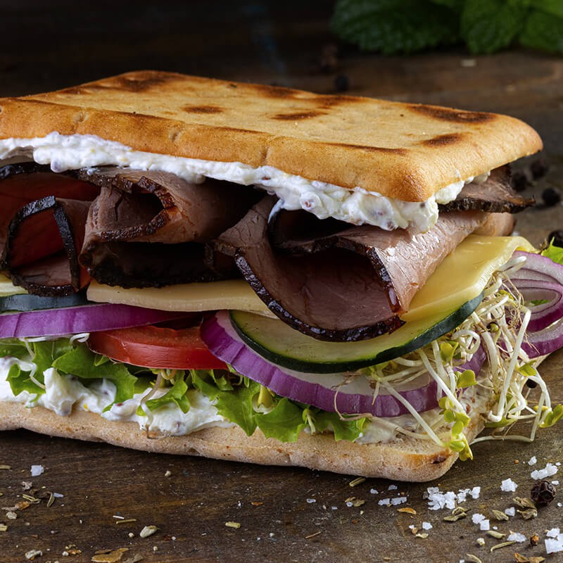 2.- Para cada uno de los paninis, tostar en la plancha el pan, aderezar, colocar hojas de lechuga, germinado, rebanadas de tomate, pepino y cebolla morada, una rebanada de queso manchego y dos rebanadas de roast beef, servir.
