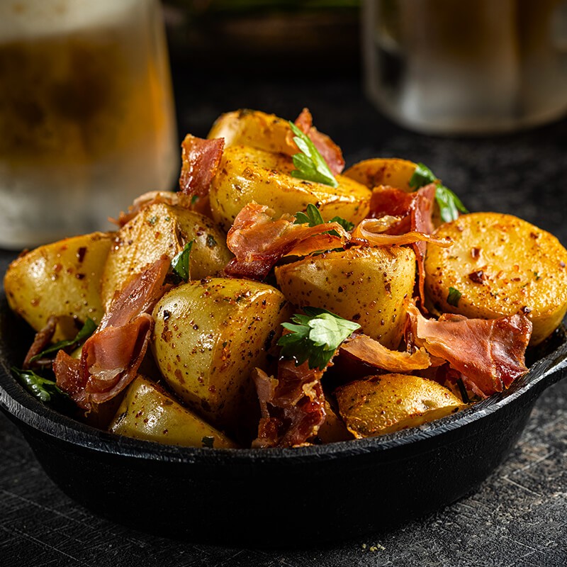 Patatas Bravas al sartén con chips de Jamón Serrano