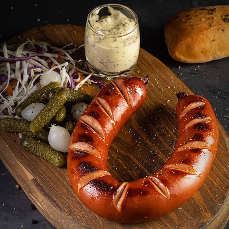 5.-Servir la salchicha acompañada de la ensalada de col, los pepinillos y el pan.
