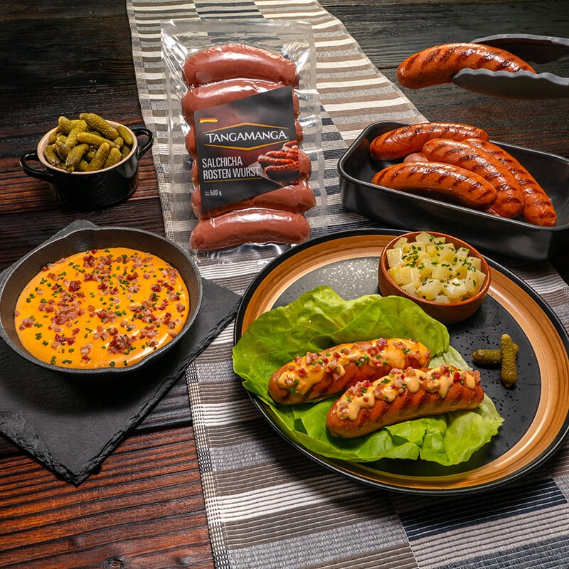 Salchicha Rosten Wurst, ensalada de Papa y pepinillos miniatura