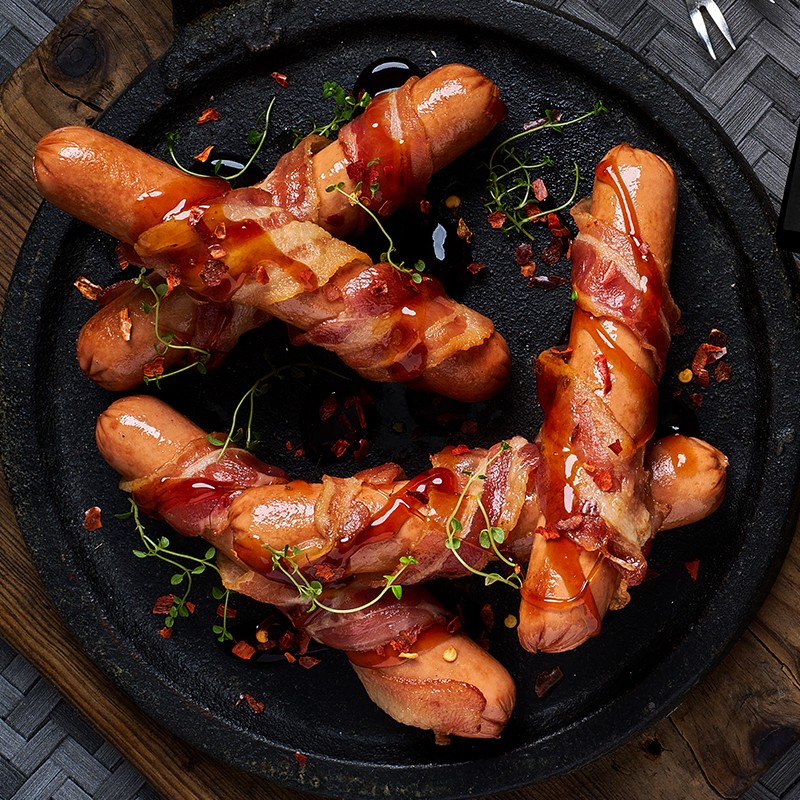 1.-Envuelve las salchichas en una rebanada de tocino y fríelas en un sartén con aceite.