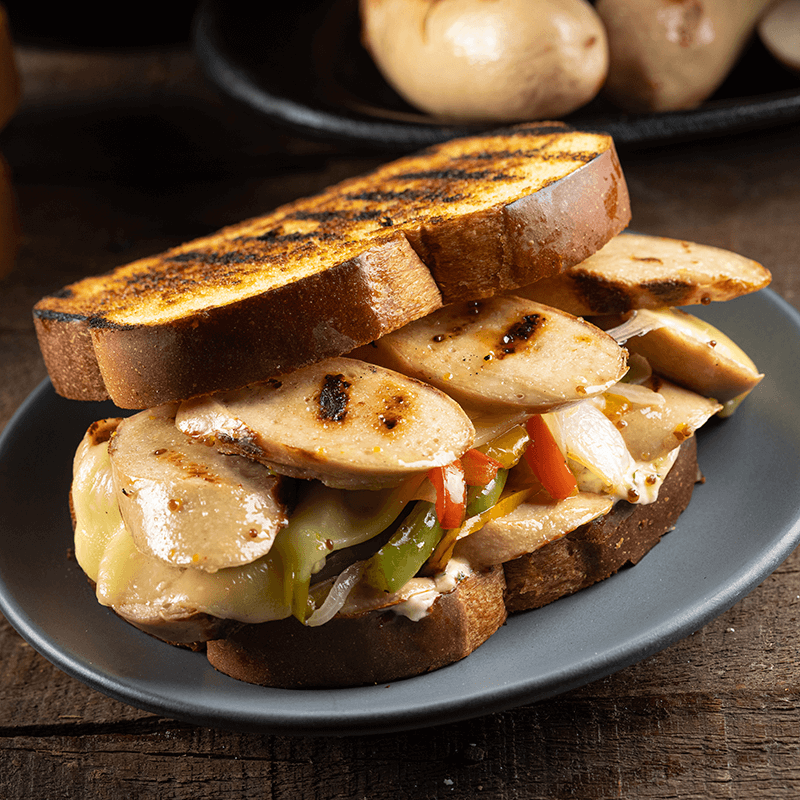 5. Tostar el pan en una plancha, untar cada rebanada con mayonesa, colocar rebanadas de salchicha, agregar las julianas asadas, la rebanada de queso, otra capa de rebanadas de salchicha y cubrir con el pan