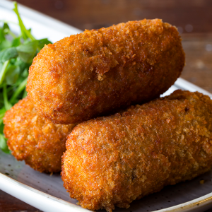 3.-Luego, forma torres de papas y agrega una rebanada de Roast Beef Tangamanga y ralla queso parmesano y perejil picado.