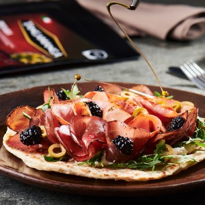 2.- Para cada uno de los paninis, tostar en la plancha el pan, aderezar, colocar hojas de lechuga, germinado, rebanadas de tomate, pepino y cebolla morada, una rebanada de queso manchego y dos rebanadas de roast beef, servir.