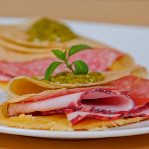 2.- Envolver el queso brie con el jamón serrano, cubriéndolo por completo.